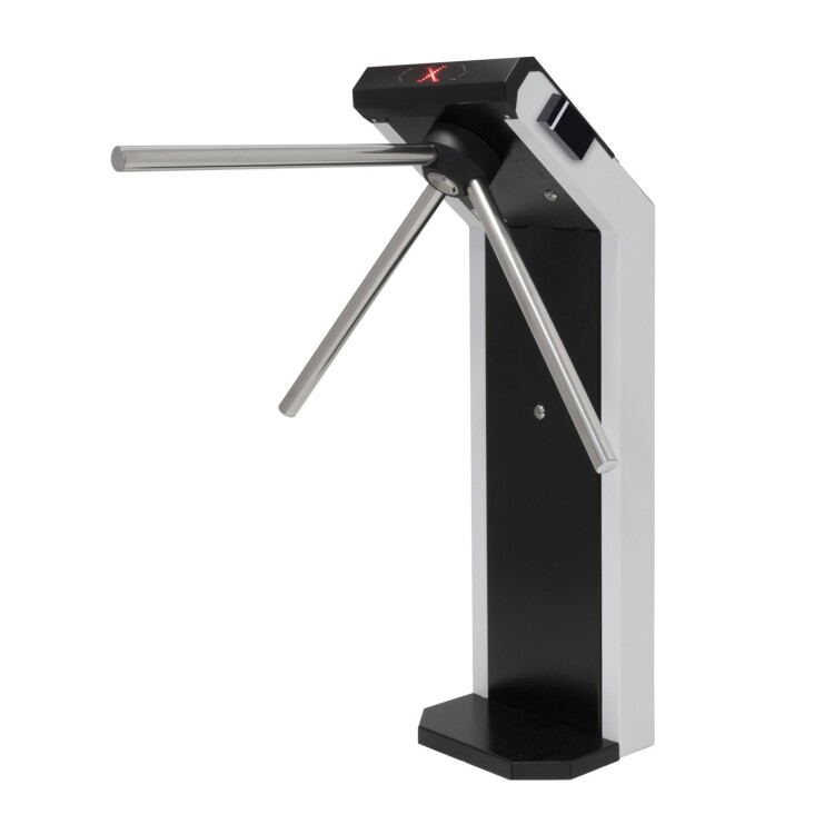 Стоечный электромеханический турникет-трипод 3V Model V. Модель турникета с закрытым нижним кожухом. Подходит для установки на проходных в офисных и административных зданиях. Является более экономичным вариантом турникета-трипода с предусмотренной закрываемой на ключ нишей для установки дополнительного оборудования.
