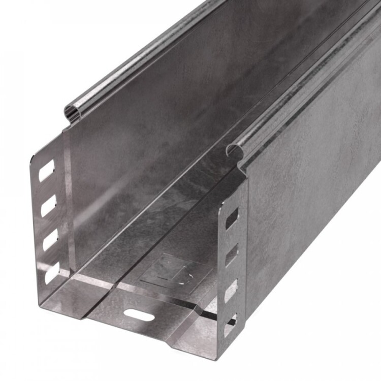 Особенностью конструкции являются продольные ребра жесткости, которые значительно повышают устойчивость лотка к изгибу и нагрузкам при эксплуатации. Соединение "папа-мама" облегчает сборку, а крышка на защелках позволяет быстро получить доступ к кабелям без использования инструментов.
