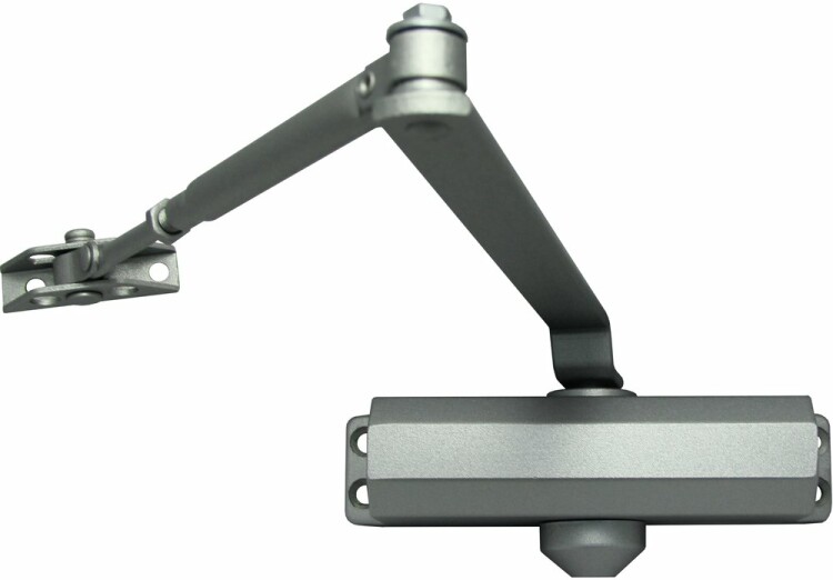 Доводчик для дверей весом до 65 кг, двухскоростной, установочный размер 206х19 мм, температура застывания гидравлической жидкости -51°С, цвет - серебро
